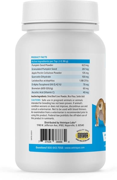 Vetnique Labs Glandex Anal Gland Support with Pumpkin, Probiotics & Fiber Beef Liver Powder is a scientific formula that works in multiple ways to keep the anal glands healthy and is a more effective alternative to frequent anal gland expressing which can further irritate the anal glands. Using a unique fiber blend, it helps to create firm and bulky stools, which help the anal glands empty naturally every time your pet defecates. This supplement also contains natural anti-inflammatories to reduce the underlying inflammation and allergies that trigger anal gland problems and reduces irritation of the anal glands. Maintaining overall digestive health is a vital part of healthy anal glands and that's why this supplement is also formulated with probiotics to maintain your pet's gastrointestinal health and to boost your pet's immunity.