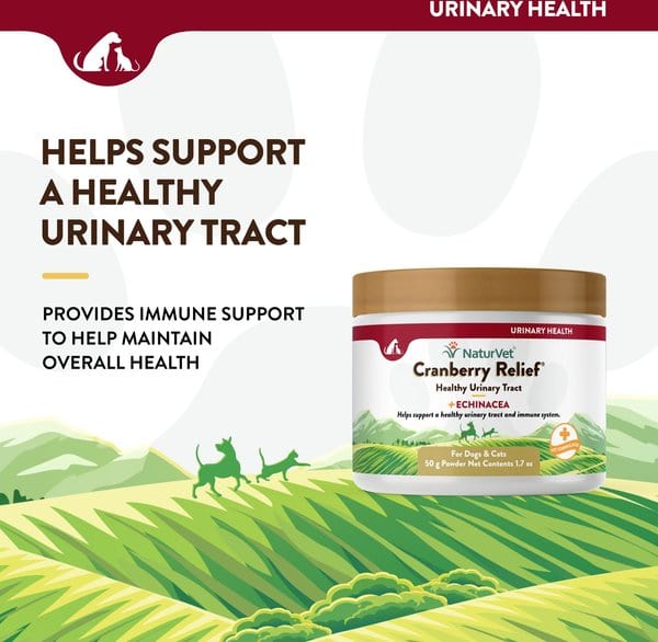 NaturVet Cranberry Relief for Dogs and Cats is a specially formulated cranberry supplement for dogs and cats with added Echinacea to provide essential immune support and promote a healthy urinary tract. Help support and maintain your dog or cats healthy urinary tract with our tasty Cranberry Relief Powder!