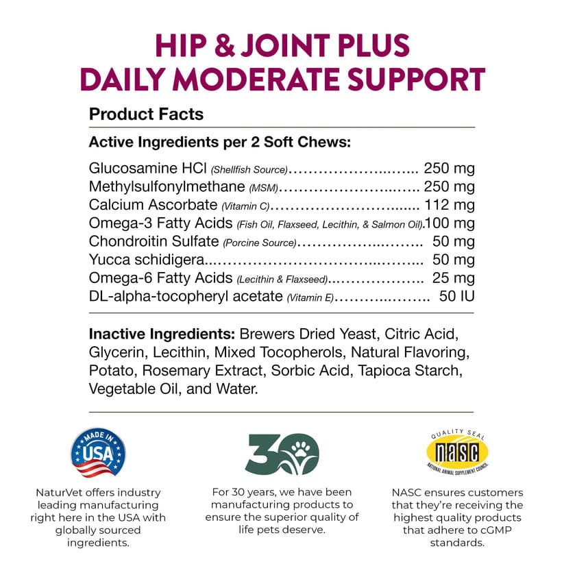 NaturVet Hip & Joint Plus Soft Chews help support healthy hip and joint function. This special formula helps to support joints and maintain healthy cartilage and connective tissues.