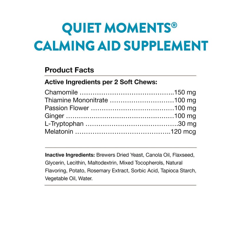 Quiet Moments Dog Calming Soft Chews. Veterinarian formulated for use in dogs over the age of 12 weeks. A unique blend of Thiamine and L?Tryptophan help reduce stress and tension. Ginger supports sensitive stomachs which is especially important when traveling, while Melatonin helps to promote rest and relaxation.?