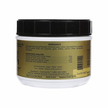 Desiccated liver, Norwegian kelp, amino acids and enzymes, imported yeast cultures, flaxseed, lecithin, garlic concentrate, lactobacillus acidophilus, and calcium citrate. No wheats, glutens, sugar, preservatives, by-products, grains, corn, or preservatives.