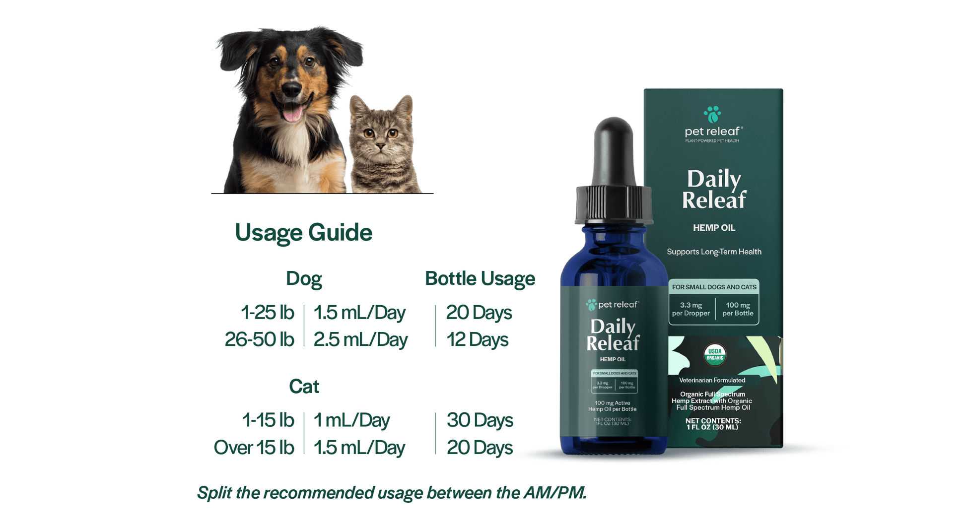 Dogs: 1-25 lb 1.5 mL per day; 26-50 lb 2.5 mL per day. Cat: 1-15 lb 1 mL per day; over 15 lb 1.5 mL per day. Split the recommended usage between the AM/PM and administer on an empty stomach