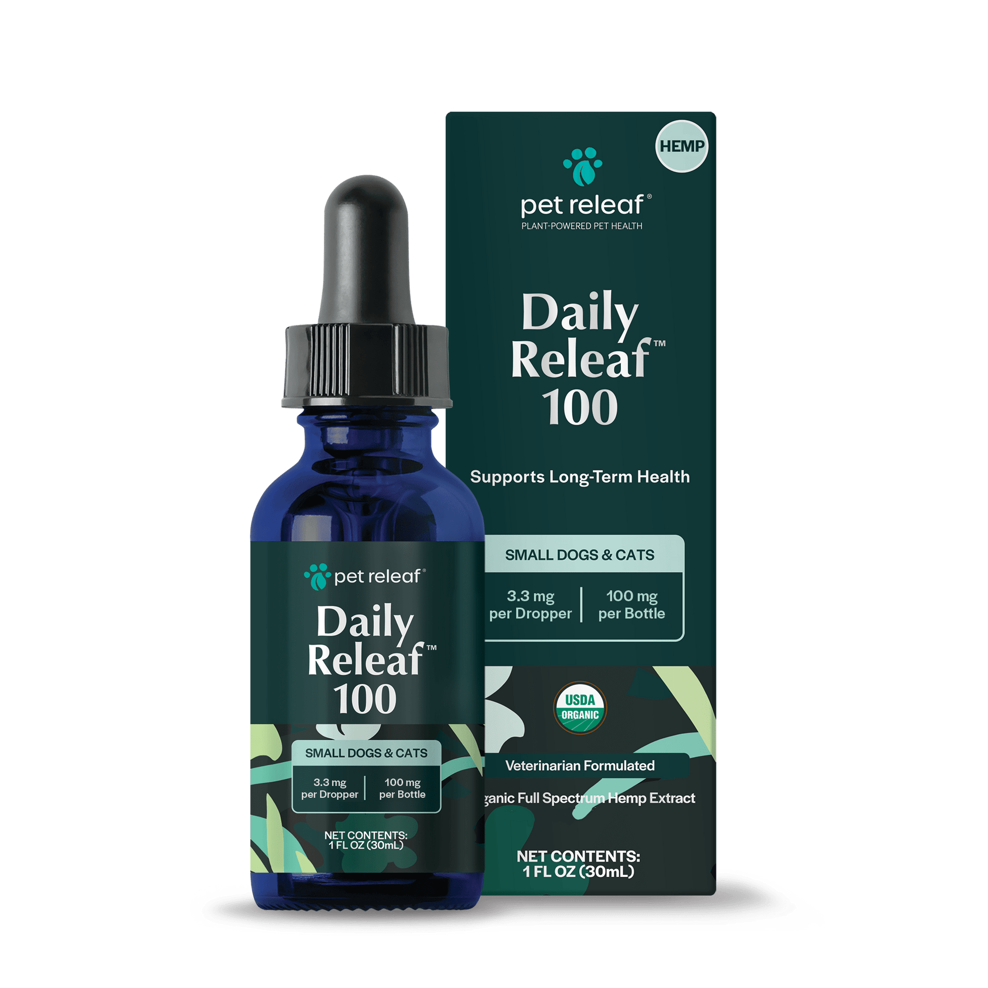 Daily Releaf 100mg Hemp Oil for small dogs and cats may support situational stress and occasional joint discomfort. Pet Releaf¡¯s Daily Releaf 100mg Hemp Oil for Small Dogs & Cats may help support a normal inflammatory response for your dog by using the natural health benefits of hemp.