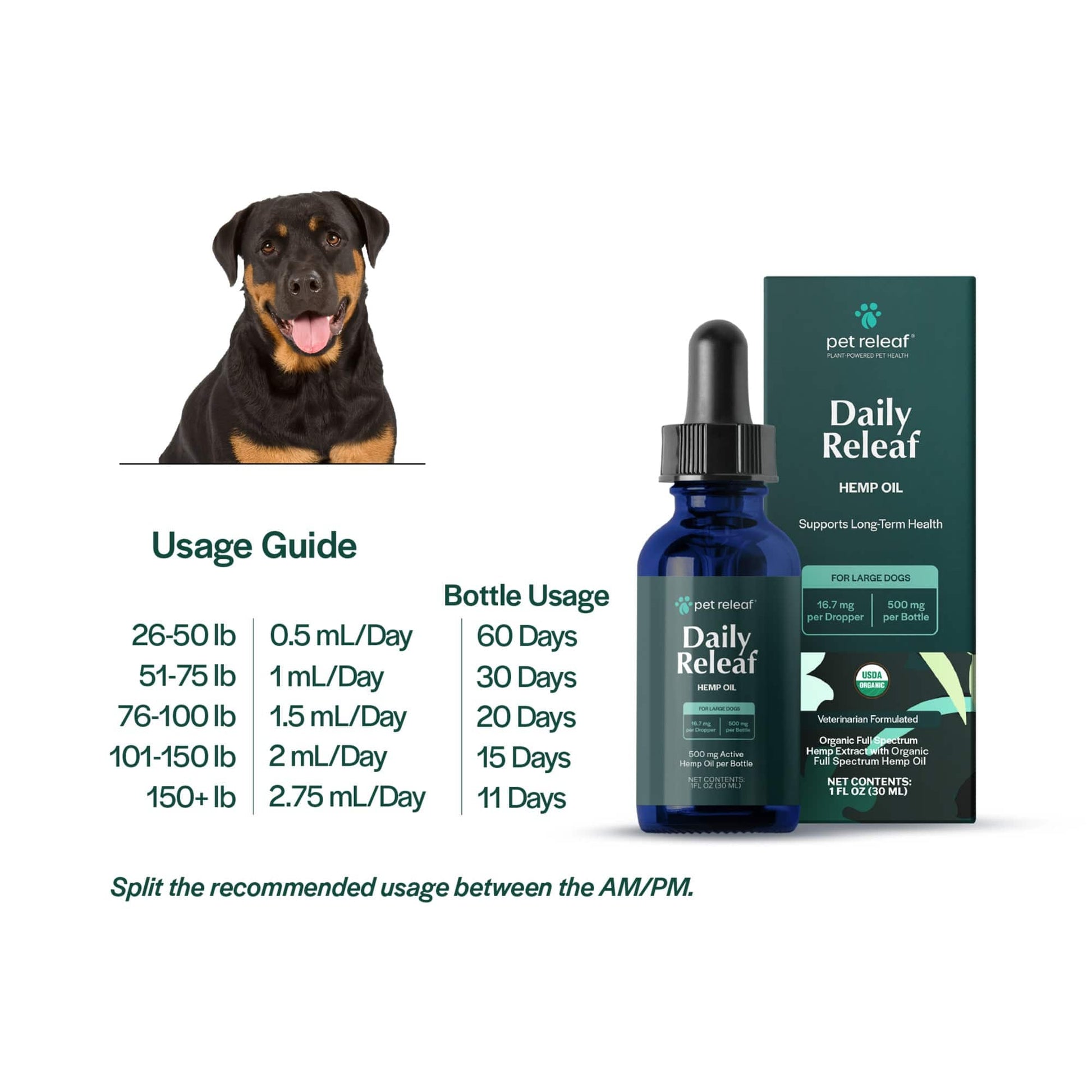 Dog 26-50 lb .5 mL/Day, 51-75 lb 1 mL/Day, 76-100 lb 1.5 mL/Day, 101-150 lb 2 mL/Day, 150+ lb 2.75 mL/Day. Split the recommended usage between the AM/PM and administer on an empty stomach