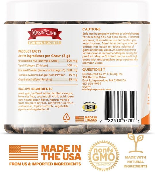Active Ingredients: Glucosamine HCL (Shrimp & Crab), Type II Collagen (Chicken), Flax Seed Powder (Source of Omega-3), Turmeric (Curcuma longa) Root Powder, Chondroitin Sulfate (Porcine).