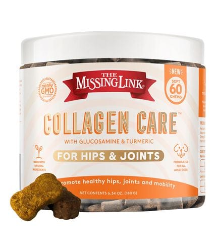 Help your dear old buddy ease those achy hips and joints with Absorbine The Missing Link Collagen Care Hips & Joints Soft Chew Dog Supplements. He¡¯ll know that you want the best for him and he¡¯ll love the taste of these bite-sized soft chews. With 500 milligrams of glucosamine in every chew, these are designed to support joint comfort and flexibility. They also contain collagen that provides amino acids for bone strength, chondroitin to help maintain cartilage and connective tissue, and turmeric to support a health inflammatory response.