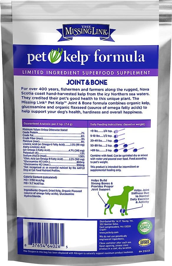 Put the pep back in your pup¡¯s step with The Missing Link Pet Kelp Formula Joint & Bone Dog Supplement. Just one daily spoonful of glucosamine will help build strong bones and support joint health in any dog. The key ingredient in this supplement is Nova Scotia kelp, chosen for its trace minerals, which function to regulate energy and aid in digestion, as well as support the immune system, skin and bone systems. This limited-ingredient superfood supplement is packed with the natural goodness of organic kelp and flaxseed, and adds essential vitamins and minerals needed support your dog¡¯s overall health. Keep your dog feeling young and spry with this easy to feed supplement.